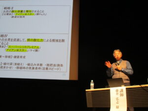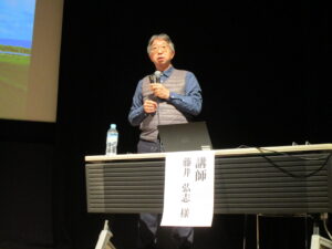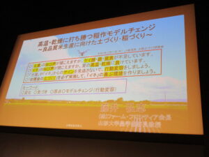 演題は「高温・乾燥に打ち勝つ稲作モデルチェンジ~良品質米生産に向けた土づくり・稲づくり~」とし、近年の気象変動を踏まえた稲作の考え方についてお話ししました。